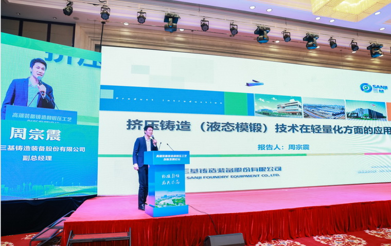 苏州三基铸造装备股份有限公司副总经理周宗震作“挤压铸造(液态模锻)技术及在产品轻量化上的应用”主题演讲